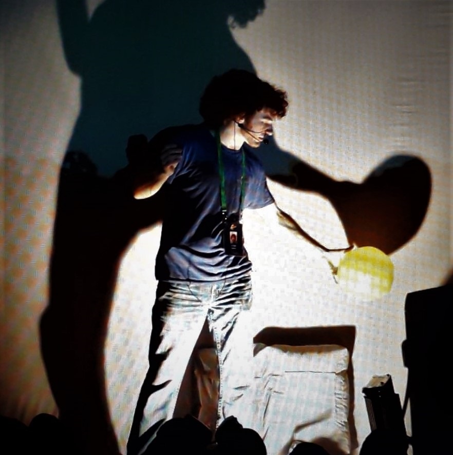 Philipp Holz erklärt Größen und Abstände in unseren Sonnensystem den Schüler*innen der Heinrich-Heine-Gesamtschule in Dreieich.